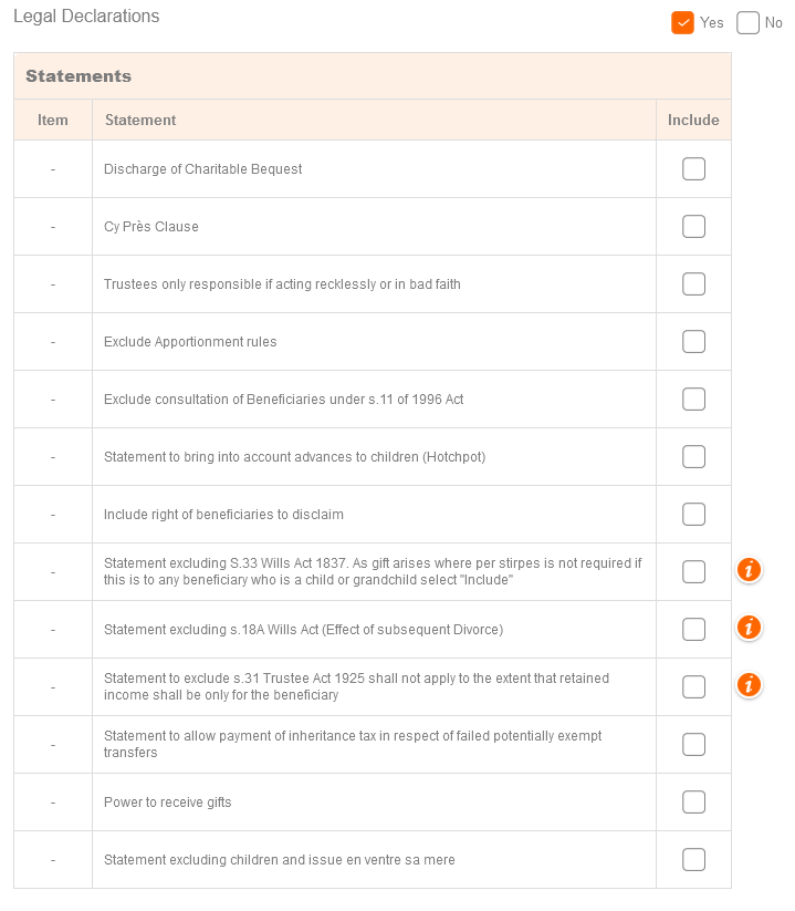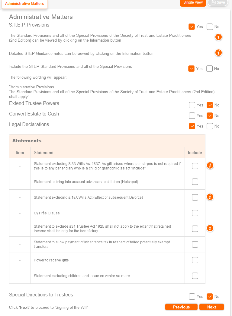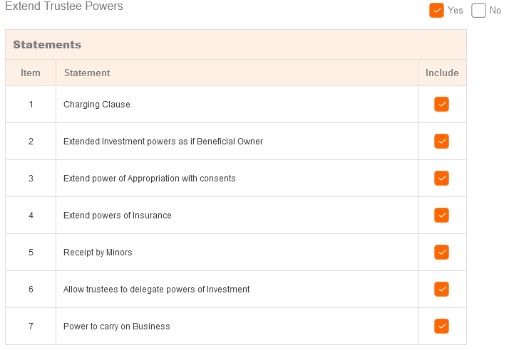 The first question you will see is to Toggle STEP Provisions. Selecting 'Yes' will include a clause in your document stating it has been drafted inline with these provisions. Selecting 'No' will remove this clause and you will see more options in the 'Extend Trustee Powers' section.