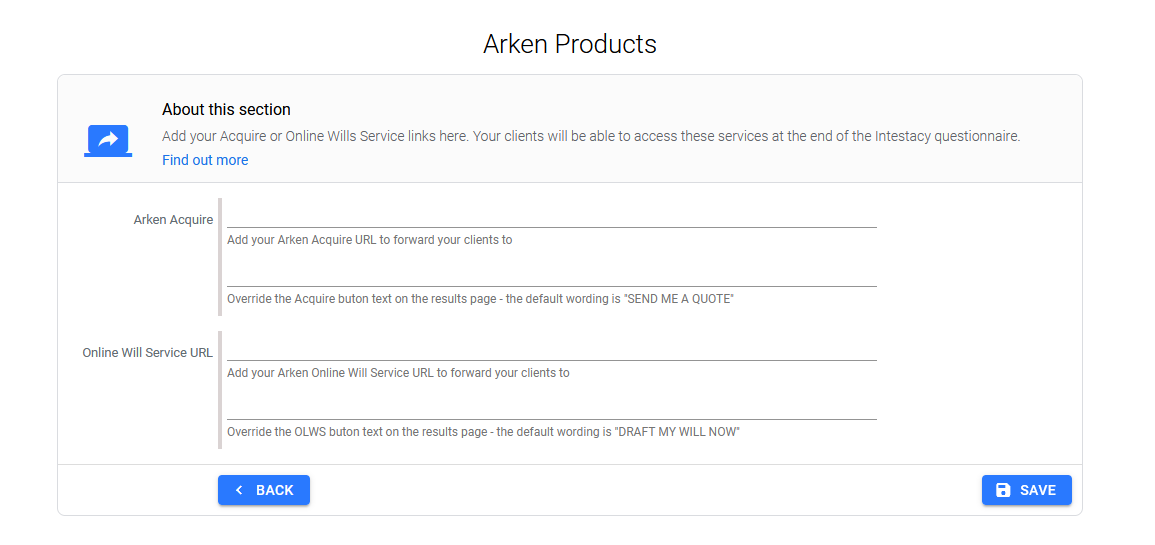 - Arken Acquire - You can find this URL in the Acquire provisioning tool. This will enable the "Send me a quote" button at the end of the Intestacy questionnaire which will take your clients into your Acquire.