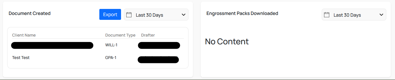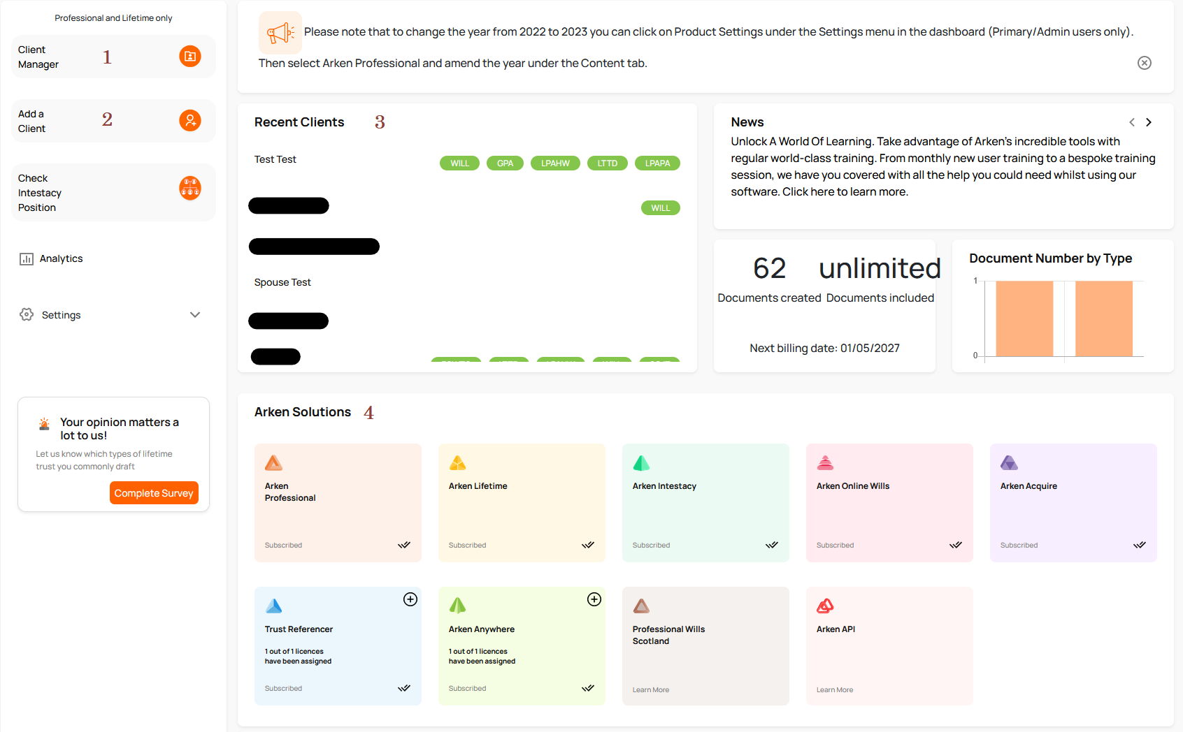 3. Recent Clients - This section is to the right of the Client Manager button. This will display your clients which have been accessed most recently. If you click the Clients name, it will take you to the Client page within the Client Manager. To the right of the Clients name you can see the documents drafted for that client; if you click the document type it will take you straight into Arken Professional to begin drafting/editing this document.
