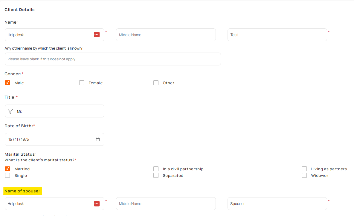 3. Once the Spouse details have been entered, you should see a 'Spouse' category on the clients profile page. Click on the