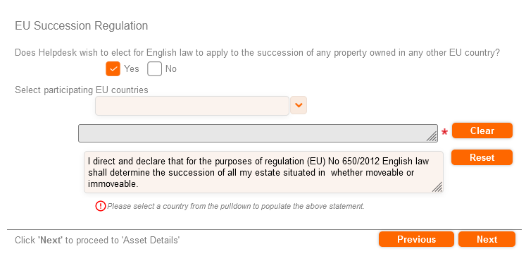 This option will add some new questions at the bottom of the page. Here you will be able to elect for English Law to apply to the succession of any property owned in any other EU country. You will see a dropdown and freetype box to include which companies are to be included. Your selection will be added to the document.