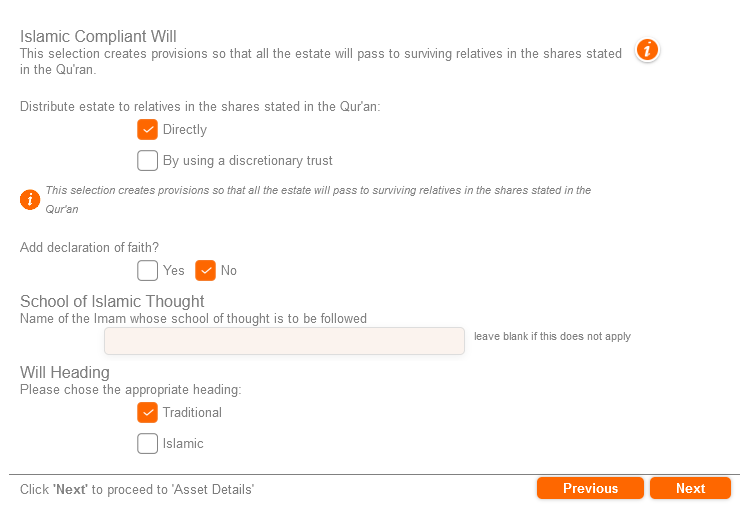When you select this option you will see some new questions at the bottom of the page. This selection creates provisions that will pass the entire estate to surviving relates in the shares stated in the Qu'ran. You will also be given the option to distribute the estate directly or by using a discretionary trust.