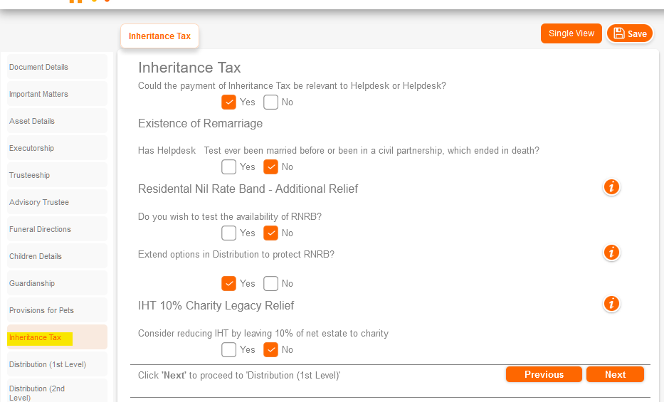 - IHT 10% Charity Legacy Relief - This question will give you two options, to add special clauses to pass 10% of the net estate or to leave general charitable bequests.