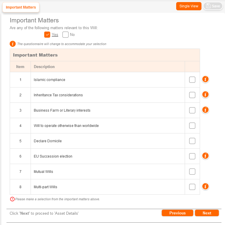 The Important Matters tab will allow you to expand on certain options of the quesionnaire. Each selection will behave differentlly, you may notice some new questions at the bottom of the page or a new tab on the left.