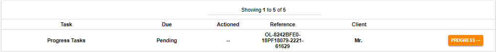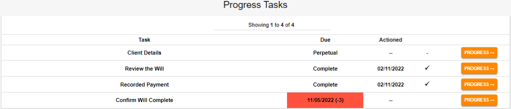 From the Task View menu you can proceed to your client's Will profile by clicking the 'Progress' button that corresponds to the client's name in the Task View table.