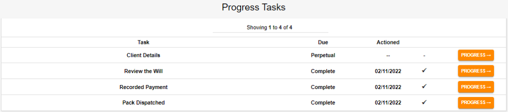 The amount of information available in the 'Progress Tasks' area for a particular profile is dependant on the service type of the Will. See below: