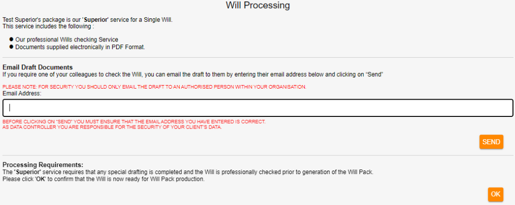 To check the Will documents, enter an email address to send the documents to. Draft documents will have the word "Draft" overlayed on them.