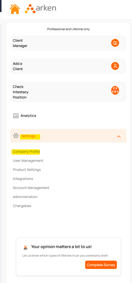 From the Dashboard, click Settings on the left, then Company Profile. Please note, you will need to be an Admin or Primary user to access these settings
