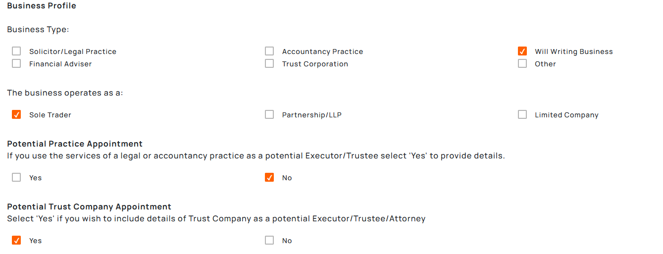 If you consistently use other companies as potential Executors, Trustees and/or Solicitors then you can enter their details in the 'Potential Practice Appointment' and/or 'Potential Trust Company Appointment' sections.