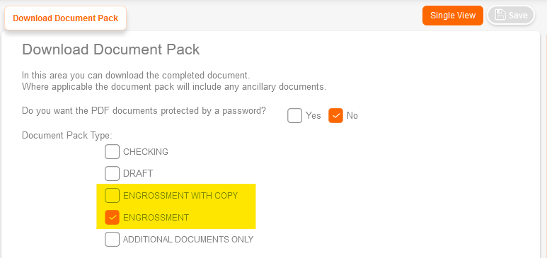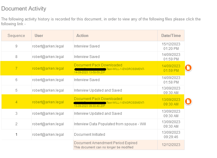 Additionally, in the 'Download Document Pack' within the questionnaire, you will see a Document Activity table, which will show when a document was downloaded and when it was engrossed.